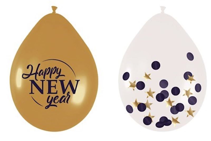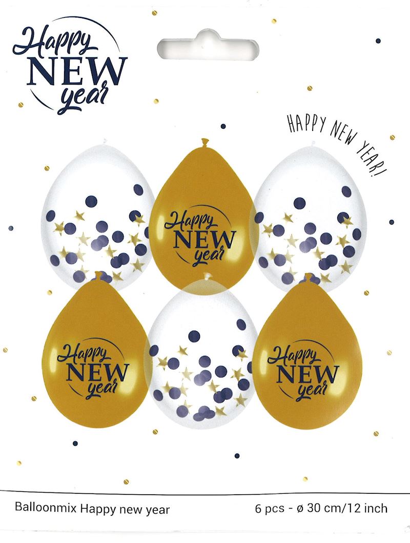 Gummiballone Happy New Year mit Konfetti 6 Stk. 30 cm