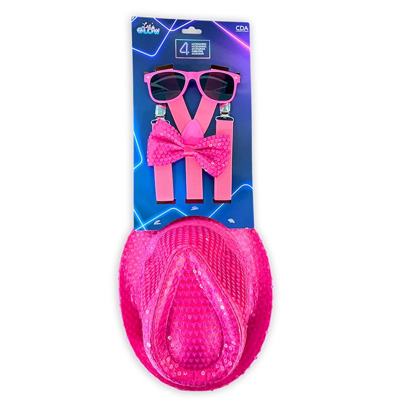 Party Set Hosenträger, Fliege Brille und Hut, neon rosa