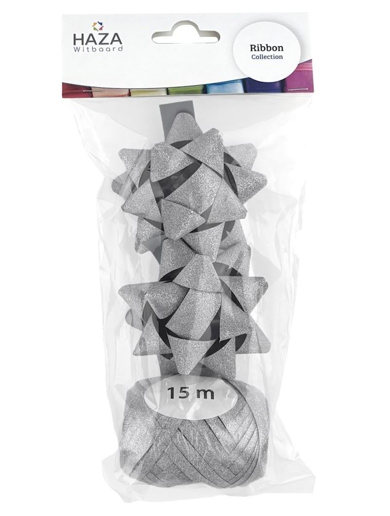 Polyband Geschenk Set, glitzer silber, 2 Schleifen, 1 Rolle
