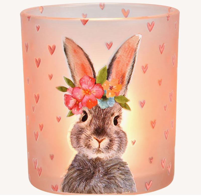 Windlicht Hase Dekor aus Glas rosa, 7x8x7 cm