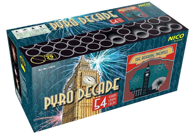 Langlaufende grosskalibrige 54 Schuss Batterie, vielfältige Effekte geschossen in Gabeln, Fächern und Salven mit bunten Sternbuketts, rauschenden Verwandlungssternen, Titan-Lanzen und grosse Dahlien Sternen, endend in einem Finale mit zwei breiten Salven mit lang ziehenden Time-Tree Effekten.