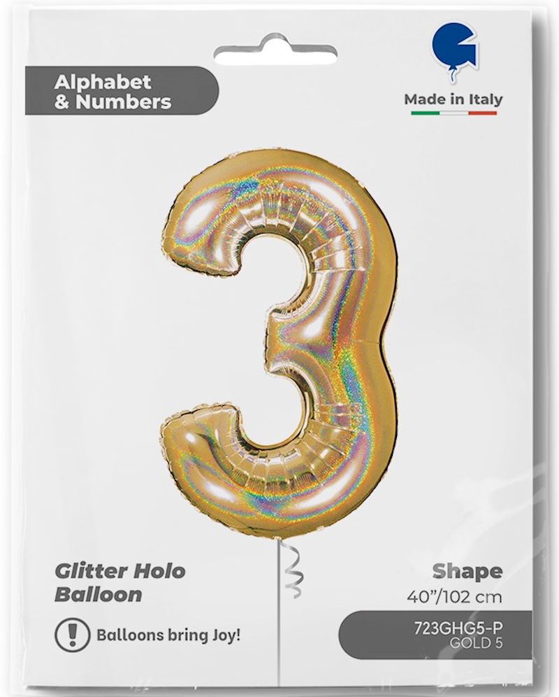 Folienballon Zahl 3 Gold, 102 cm, im Beutel, holographisch
