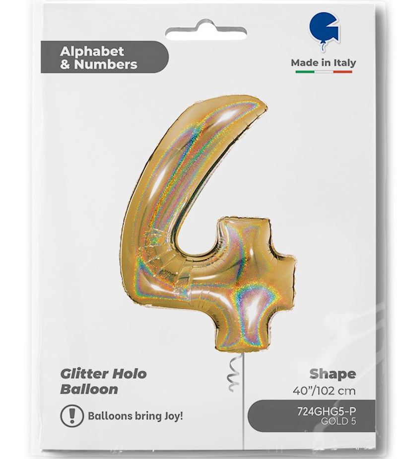 Folienballon Zahl 4 Gold, 102 cm, im Beutel, holographisch