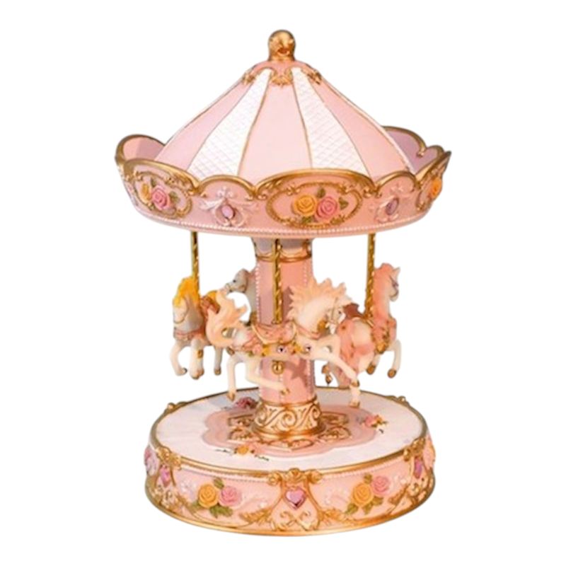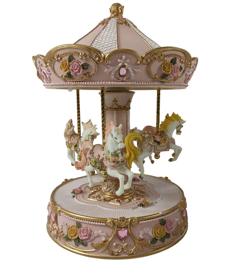 Das Karussell ist mit Rosenblüten und Ornamenten verziert. Das Dach ist rosa- weiß. Besetzt ist es mit vier reichlich verzierten Pferdchen. Zieht man das mechanische Spielwerk am Boden der Spieluhr auf, erklingt die Melodie „Kaiserwalzer“ und das Karussell dreht sich auf dem Sockel.