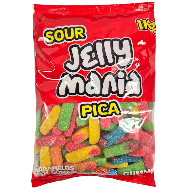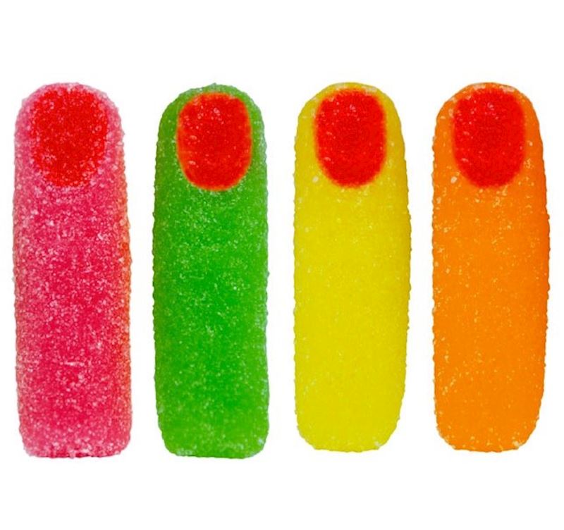 - Glukosesirup, Wasser, Zucker, Maisstärke, Gelatine, Säuerungsmittel: Citronensäure (E330), Apfelsäure (E296), Aromen, Säureregulator: Natriumcitrat (E331), Farbstoffe: Kurkumin (E100), Echtes Karmin (E120), Brillantblau FCF (E133), Paprikaextrakt (E160c)