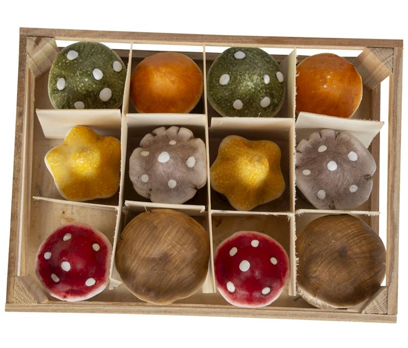 Deko Pilze 7.5 cm Set 12 Stk. in Holzbox 23x17cm 6xsort.