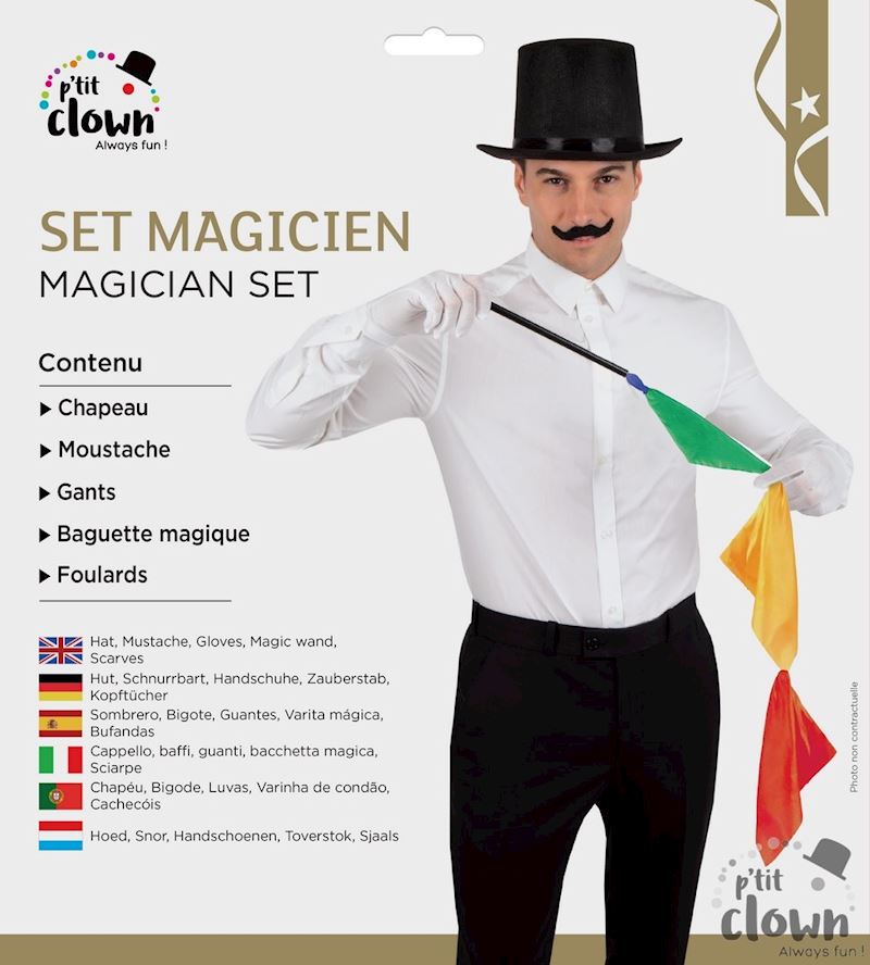 Verkleidungsset Zauberer Hut, Schnauz, Zauberstab,
