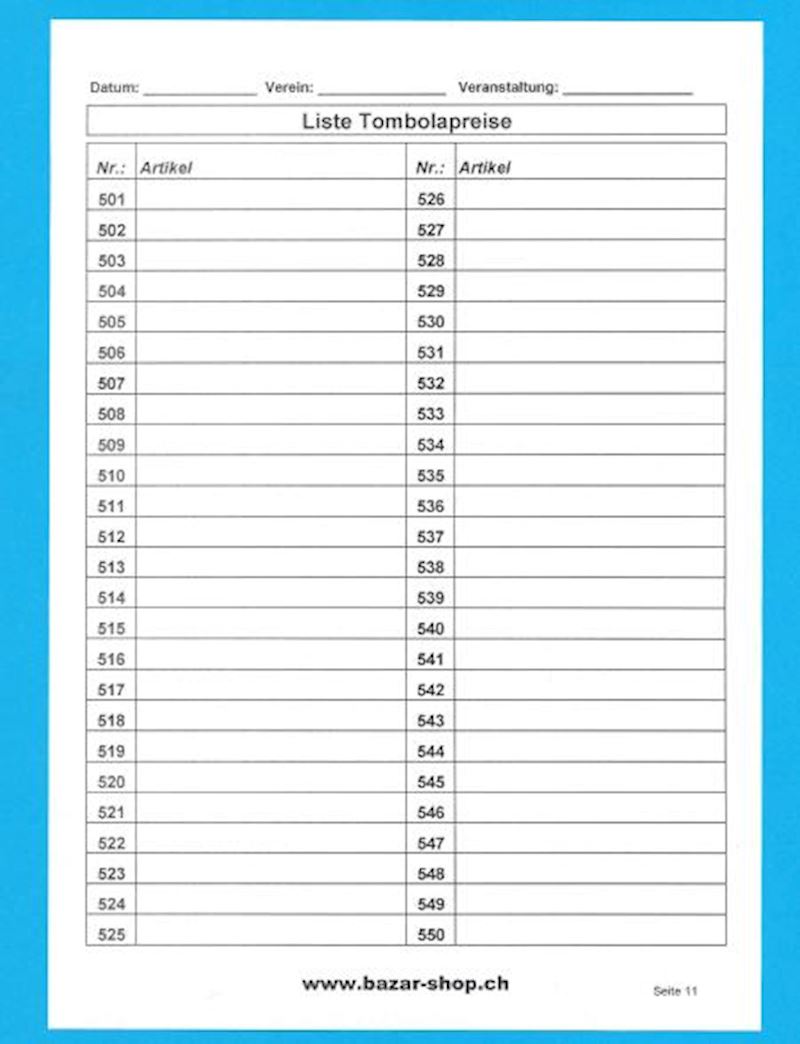 Tombola Preisliste 1-5000 50 Zahlen pro Blatt