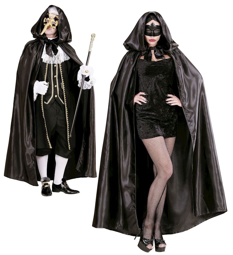 Umhang Satin mit Kapuze schwarz 145 cm lang