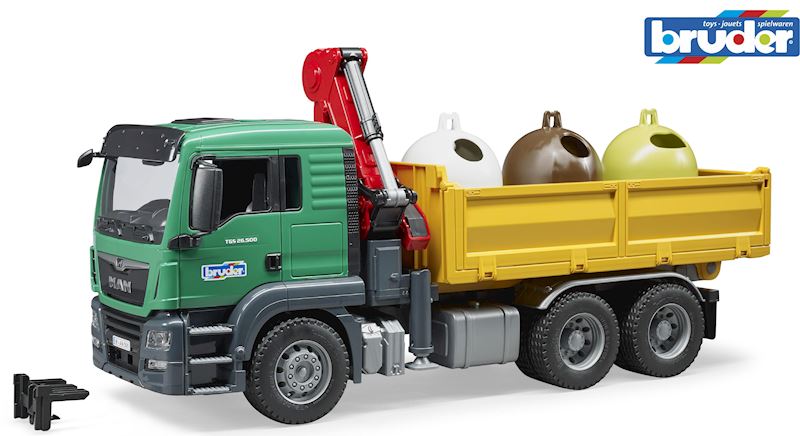BRUDER MAN TGS LKW mit Ladekran, 3 Altglascontainern