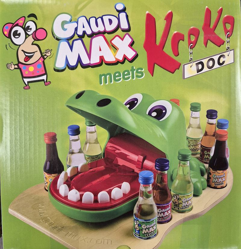 • Le Gaudi-Max Kroko-Doc est bien connu de beaucoup et constitue un jeu à boire classique. On appuie sur une dent du crocodile vert et le joueur qui se fait attraper paie la tournée. Le paquet contient le crocodile, un plateau de jeu et un total de 100 mini-bouteilles de liqueur (certaines avec colorant) dans les quatre saveurs suivantes : 25x pomme acidulée (15 % vol) 25x liqueur à la crème (17 % vol, contient du lait) 25x liqueur de prune (16 % vol) 25x liqueur de figue (16 % vol)