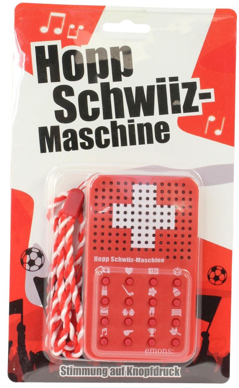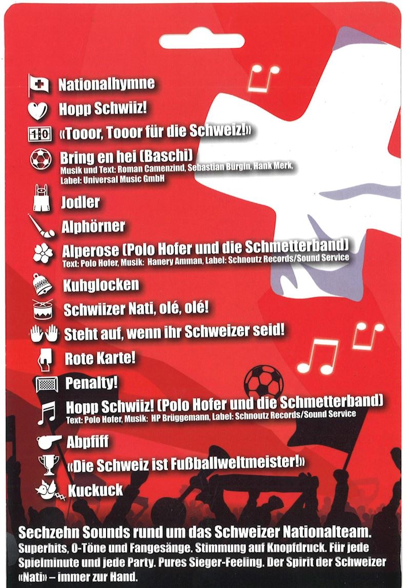 Mit folgenden Sounds: Schweizer Nationalhymne, Hopp Schwiiz!, Toor, Toor für die Schweiz, Bringe en hei (Baschi), Jodler, Alphörner, Alperose (Polo Hofer), Kuhglocken, Schwiizer Nati olé olé, Steht auf wenn ihr Schweizer seid!, Rote Karte!, Penalty, Hopp Schwiiz (Polo Hofer), Abpfiff, Die Schweiz ist Fussballweltmeister, Kuckuck.