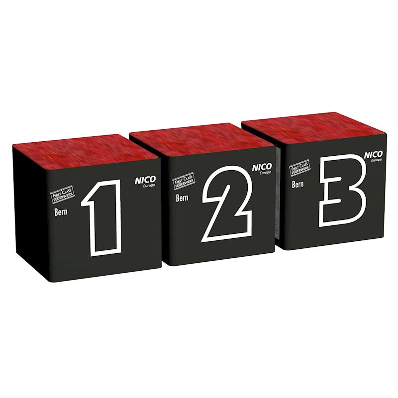 Carton d'assortiment avec 3 batteries Premium, 108 coups avec un final endiablé! ; Berne 1 : 36 coups ; En succession rapide, des bouquets de perles colorées se décomposent en étoiles scintillantes argentées ; Berne 2: ; 36 coups ; En succession alternée, des bouquets d'étoiles scintillantes colorées et des hululements argentés fantomatiques s'élèvent dans le ciel ; Berne 3: ; 36 bombes tirées rapidement se transforment en une mer d'effets de scarabées dorés éclatants.