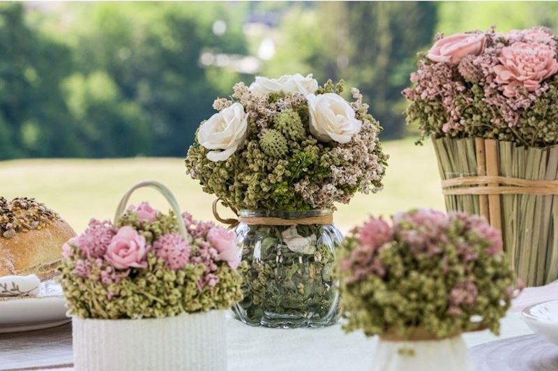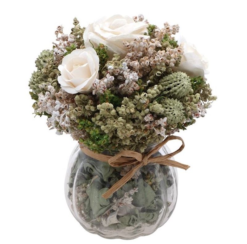 Bouquet fleurs blanches Margot dans vase verre, 12x15 cm