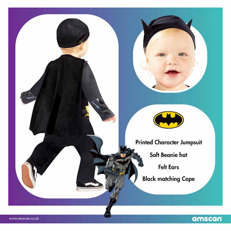 Costume pour enfants Batman Une ceinture jaune et le signe de Batman sont représentés sur la combinaison noire. Une casquette noire avec de petites oreilles de chauve-souris complète ce costume.