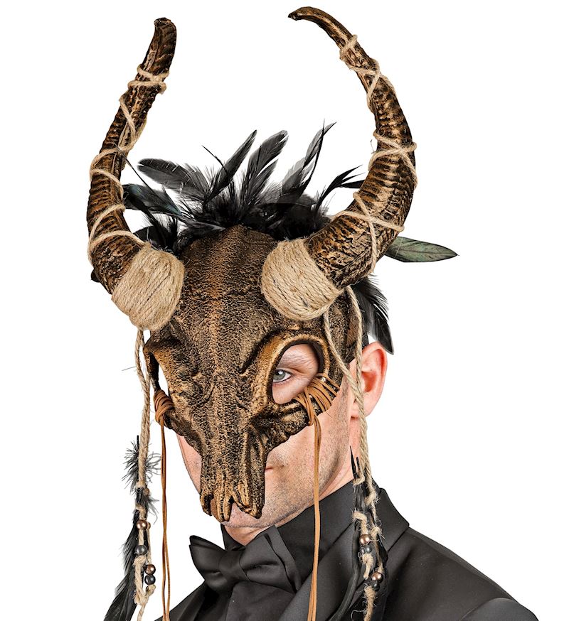 Masque chaman crâne de taureau avec plumes