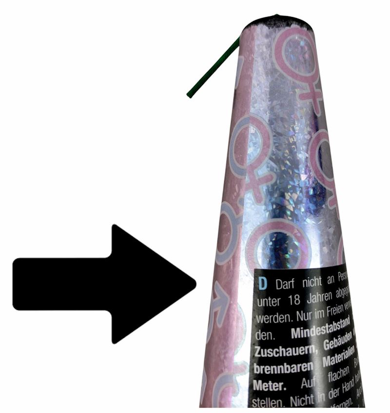 Le volcan crache d'abord une fontaine dorée dans le ciel. Dès que celle-ci atteint une hauteur de 8 mètres, les étoiles bleus révèlent le sexe de l'enfant. Veuillez noter que ce volcan, comme tous les autres, ne peut être utilisé qu'à l'extérieur et ne doit pas être allumé à l'intérieur.