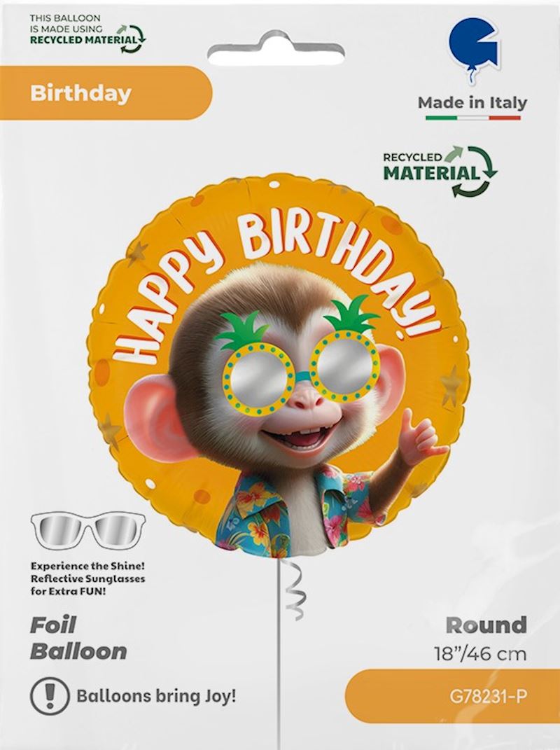 Ballon alum. singe cool, 46 cm happy birthday, emballé indiv.
