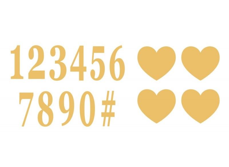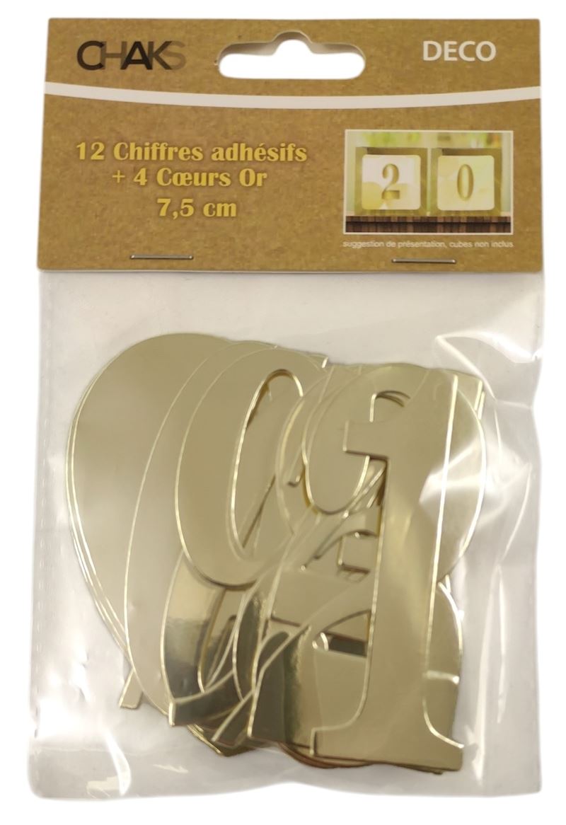 Set de 12 chiffres adhesifs + 4 coeurs 7.5 cm or