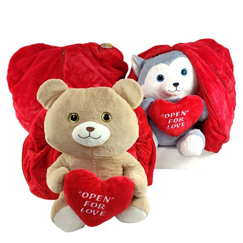 Peluche animaux en coeur rouge 55 cm, 3 ass.