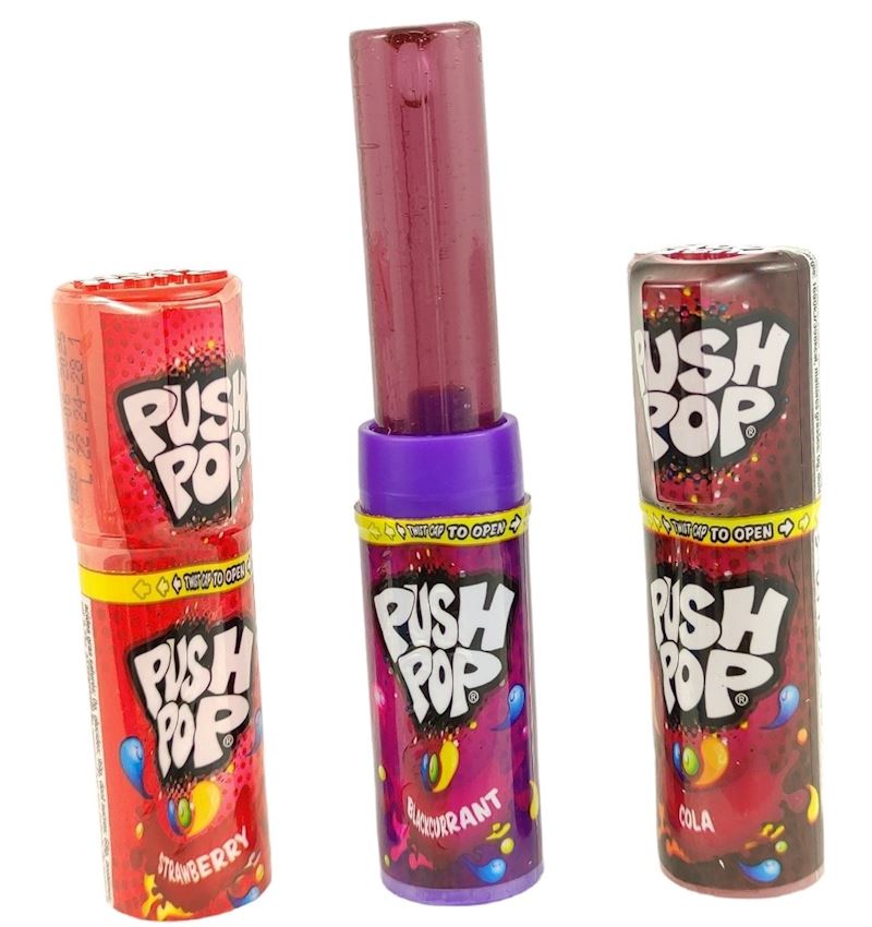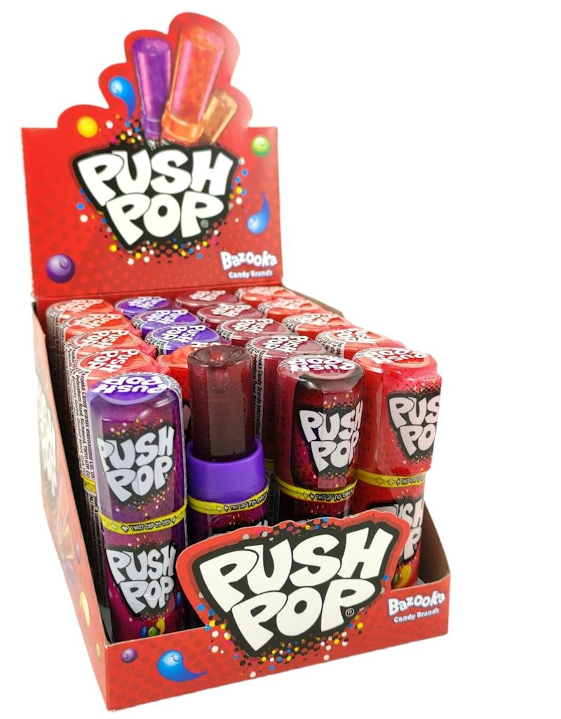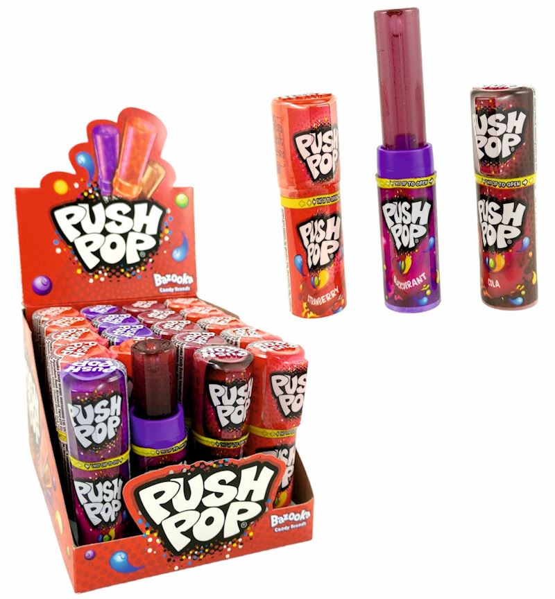 La sucette Bazooka Candy Push Pop est disponible avec un goût rafraîchissant de cola, un goût sucré de myrtille et un goût fruité de fraise.